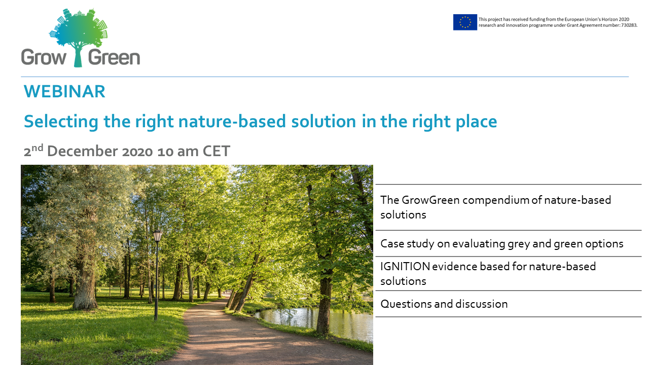This short webinar on 2nd December at 10 am CET is an introduction to resources developed by the GrowGreen and Ignition projects to support decision makers, planners, businesses and others in comparing green and grey options to use the right solutions in the right place for the right problem. It highlights the GrowGreen compendium of nature-based and ‘grey’ solutions to address climate and water-related problems in European cities, developed by Trinomics, and the Ignition evidence base for nature-based solutions.